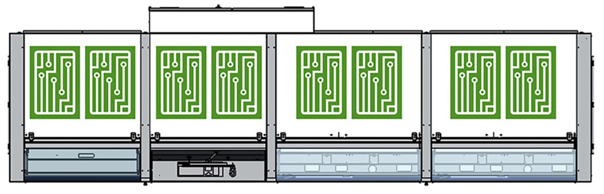 W najbardziej rozbudowanej konfiguracji system VERSAFLOW ONE X może zostać wyposażony w jeden moduł topnikowania, jeden moduł podgrzewania oraz dwa moduły lutowania. Takie rozwiązanie pozwala na równoległe procesowanie nawet ośmiu płytek PCBA w trybie inline, przy wykorzystaniu pojedynczego systemu transportowego.