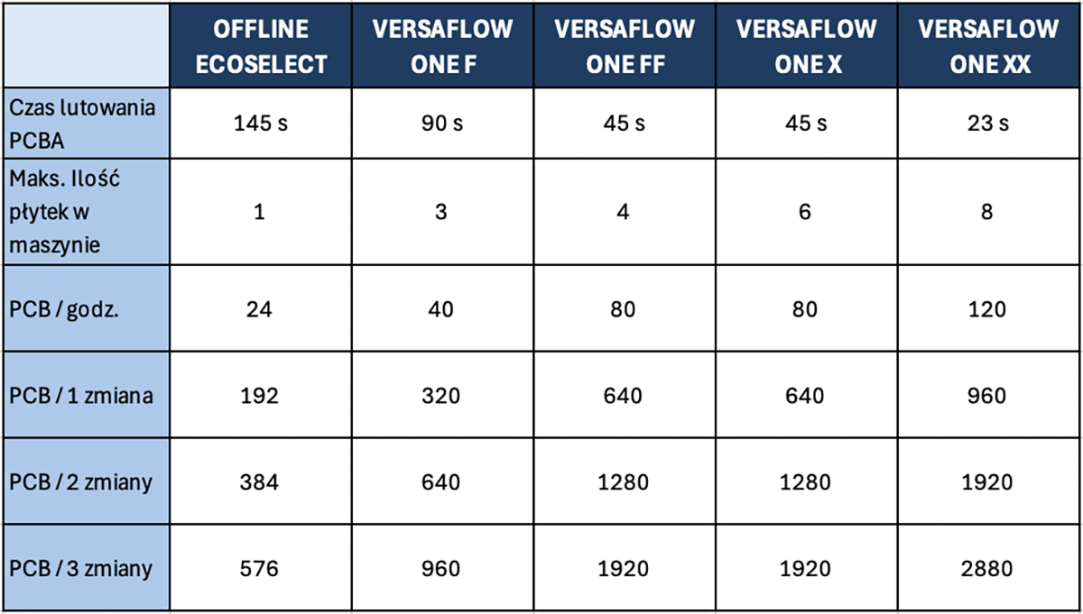 W celu zobrazowania efektywności systemów z rodziny ONE przeprowadzono symulację dla przykładowego projektu PCBA o wymiarach 300 × 300 mm, z czasem procesu obejmującym: 25 s na topnikowanie, 30 s na podgrzewanie i 90 s na lutowanie. Zestawienie maszyn offline (typu ECOSELECT) z systemami inline z serii VERSAFLOW ONE przedstawia się następująco: