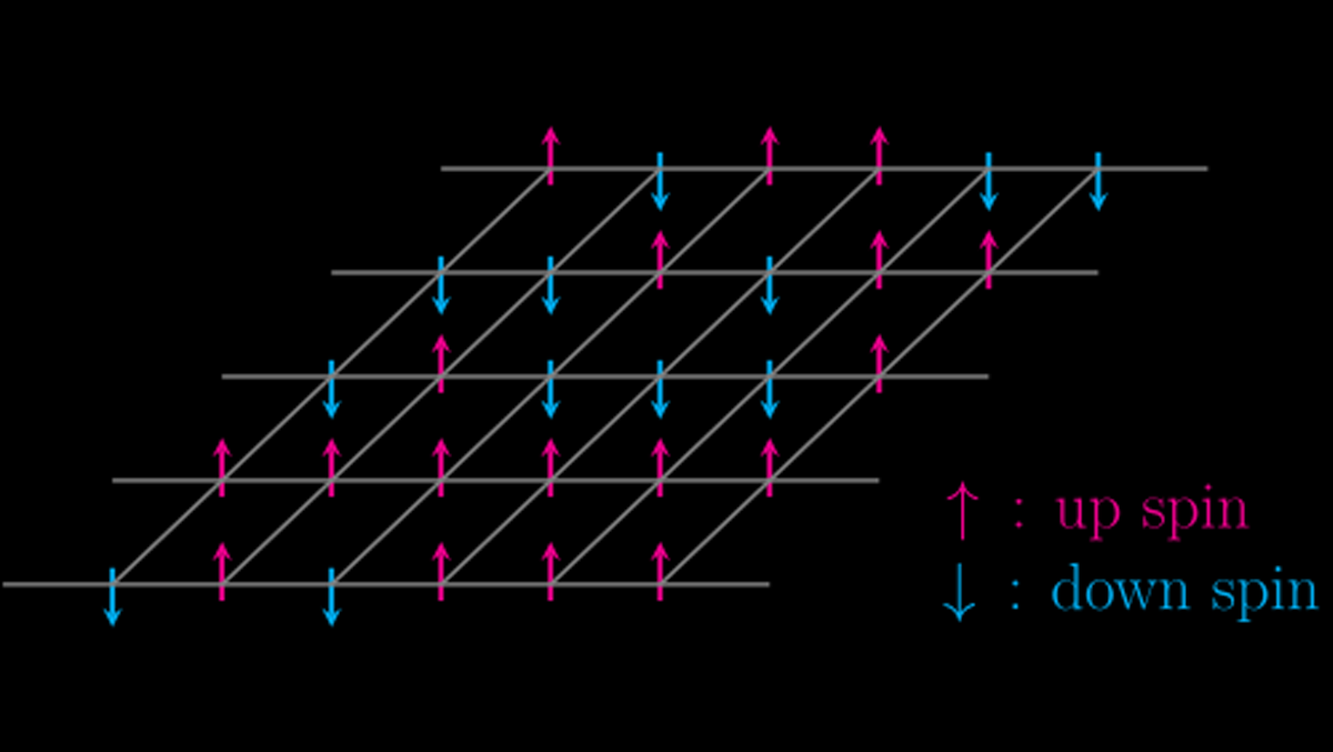 Dwuwymiarowy model Isinga przedstawiony jako kwadratowa sieć oddziałujących spinów. Źródło: Wikipedia