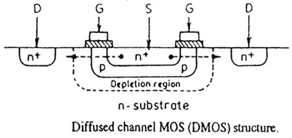 Poniższy rysunek przedstawia strukturę MOS z podwójną dyfuzją, tranzystor DMOS. Długość kanału [L], jest kontrolowana przez głębokość złącza wytworzoną przez dyfuzje typu n+ i p pod tlenkiem bramki. L jest również odległością boczną między złączem n+ p, a złączem podłoża p-n. Długość kanału można zmniejszyć do około 0,5 mikrometra. Zatem proces ten jest podobny do wytwarzania w tranzystorze bipolarnym obszaru bazy dla tranzystora bipolarnego z podwójnym dyfuzją. Gdy do bramki zostanie przyłożone dość duże napięcie dodatnie [>VTH], spowoduje to inwersję obszaru podłoża p pod bramką do typu n, a wytworzona przy powierzchni warstwa inwersyjna typu n będzie działać jako kanał przewodzący dla przepływu elektronów od źródła do drenu.