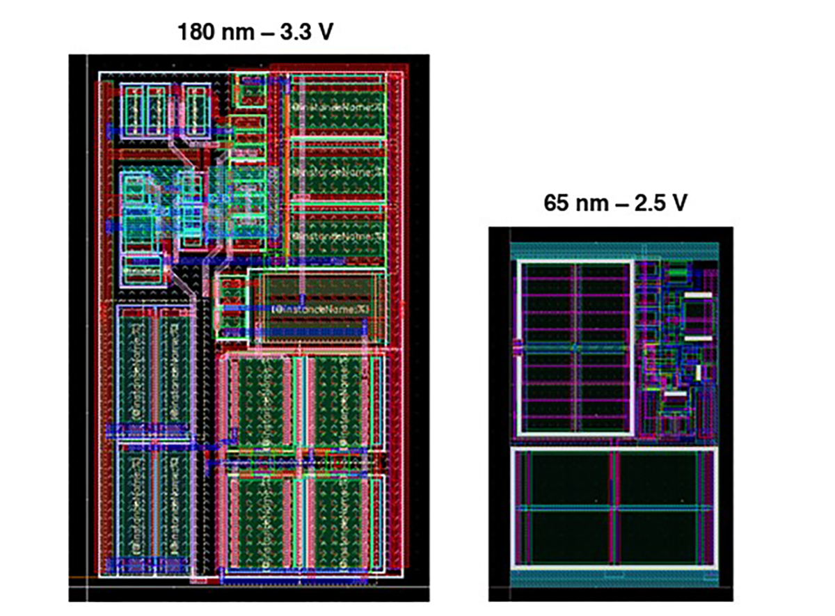 Na rysunku poniżej widzimy zmniejszenie o 45% powierzchni chipu przy zmianie technologii z  180 nm – 3,3 V do  BCD65 – 2,5 V dla układu komparatora.