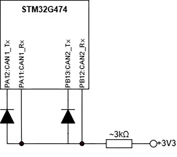 CAN1_Tx oraz CAN2_Tx są wyjściami typu push-pull, dlatego potrzebne są diody zabezpieczające.