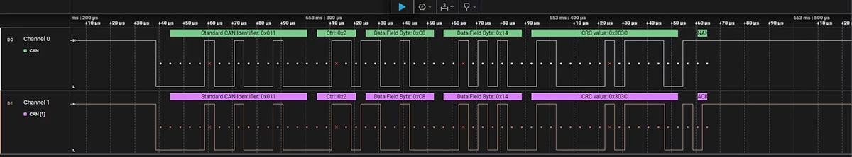 Na poniższym przebiegu przedstawiłem na kanale 0 sygnał na katodzie diody CAN1_Tx, zaś na kanale 1 przedstawiłem sygnał na liniach Rx. Jak widać na przebiegu sygnał CAN dekodowany jest poprawnie.