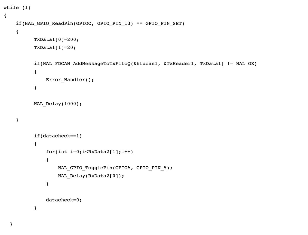 CAN1 wysyła informacje na temat częstotliwości i ilości mrugnięć diodą do CAN2 po naciśnięciu przycisku. CAN2 odbiera dane o częstotliwości i ilości mrugnięć diodą. Dalej następują mrugnięcia diodą z określoną częstotliwością i określoną ilością razy.