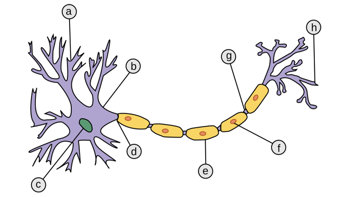 Schemat budowy neuronu: a – dendryty, b – ciało komórki, c – jądro komórkowe, d – akson, e – otoczka mielinowa, f – komórka Schwanna, g – przewężenie Ranviera, h – wiele zakończeń aksonu. Źródło: Wikipedia