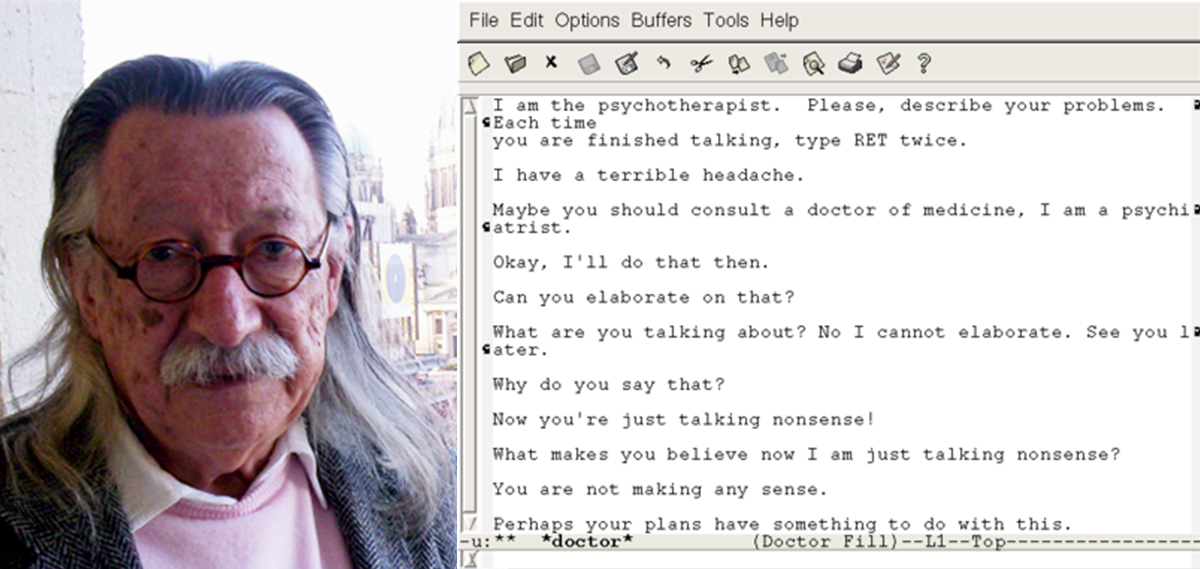 Joseph Weizenbaum, zdjęcie z 2005 roku. Źródło: Wikipedia; po prawej: Eliza – program symulujący psychoanalityka, napisany w 1966 przez Josepha Weizenbauma za pomocą języka SLIP