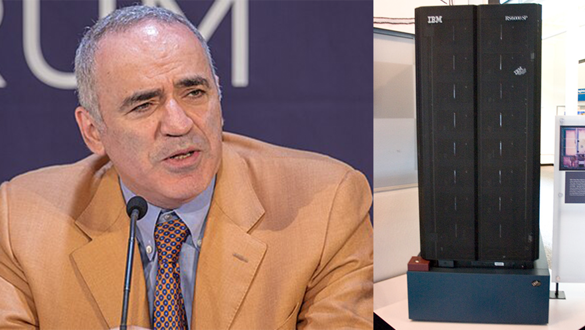Arcymistrza szachowy Garri Kimowicz Kasparow, a obok Deep Blue – komputer grający w szachy, stworzony przez IBM. Źródło: Wikipedia