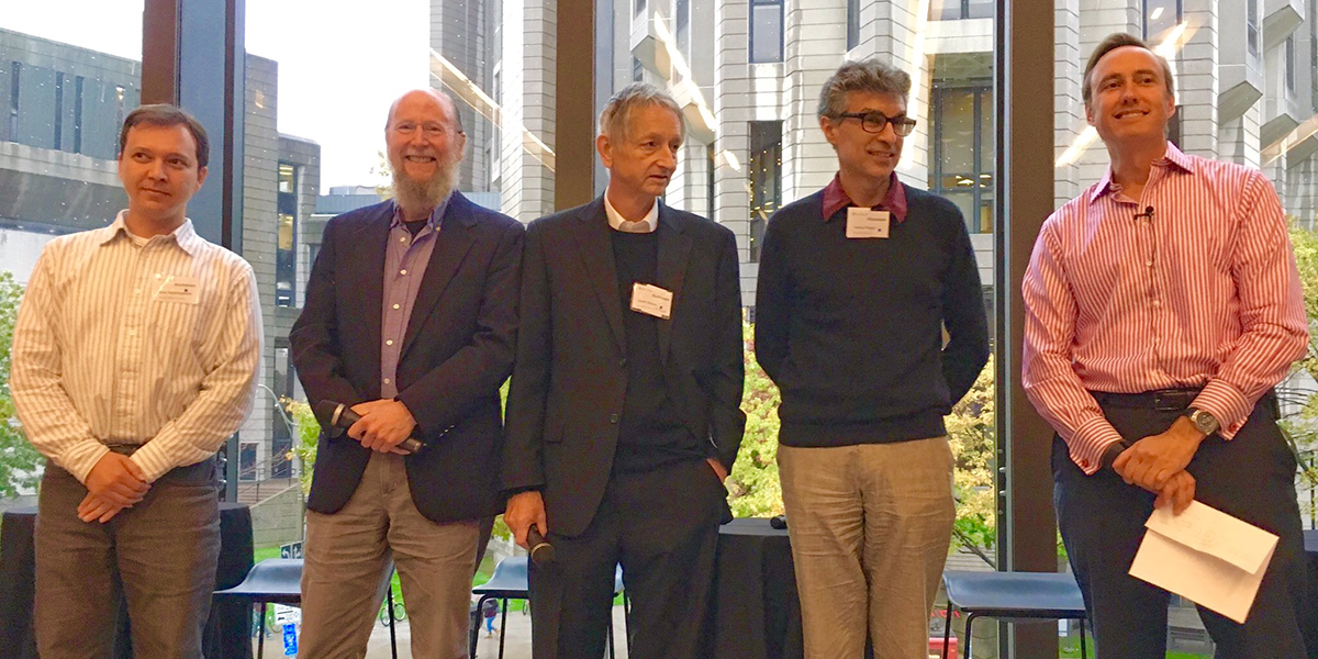 Pracownicy grupy badań nad głębokim uczeniem w 2016 roku. Od lewej do prawej: Ruslan „Russ” Salakhutdinov, Richard S. Sutton, Geoffrey Hinton, Yoshua Bengio i Steve Jurvetson. Źródło: Wikipedia