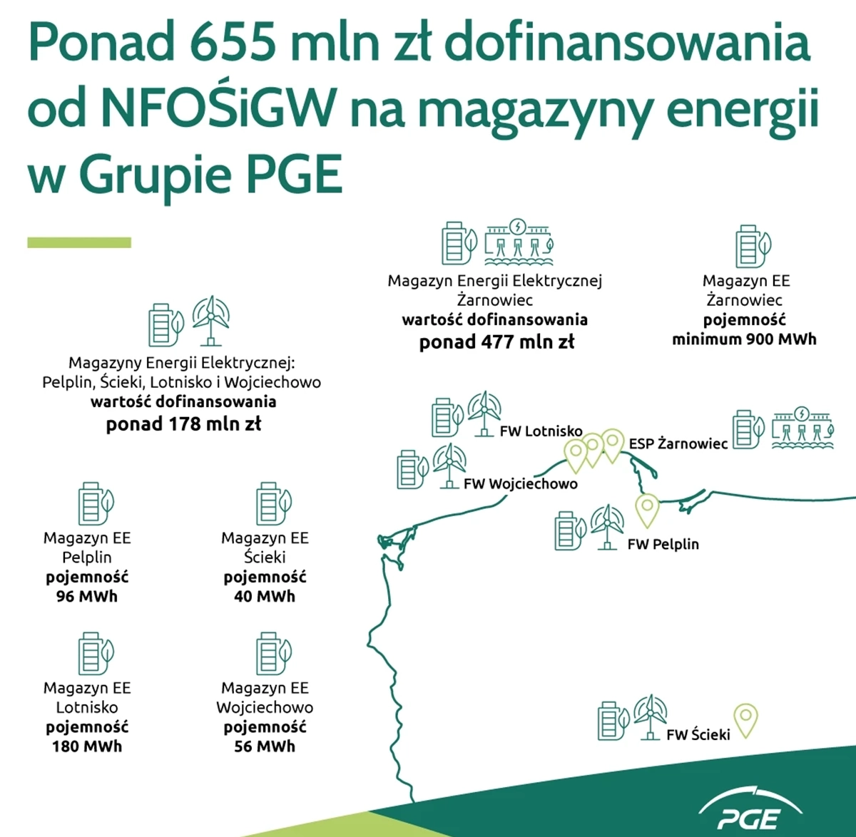 PGE otrzymała dofinansowanie z Narodowego Funduszu Ochrony Środowiska i Gospodarki Wodnej na realizację inwestycji w zakresie magazynowania energii elektrycznej. Wsparcie zostało przyznane na budowę Magazynu Energii Żarnowiec, a także na cztery mniejsze inwestycje: ME Pelplin, ME Ścieki, ME Lotnisko i ME Wojciechowo.
