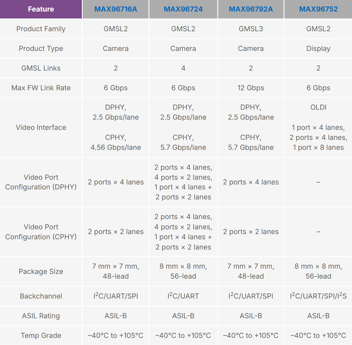 ADI rozszerzyło szeroką ofertę rynkową na GMSL dla aplikacji z kamerami i wyświetlaczami. Podstawowe parametry i cechy naszych najnowszych serializatorów GMSL2/GMSL3 zostały zestawione w tabeli 1, natomiast tabela 2 zawiera główne parametry i cechy deserializatora GMSL2/GMSL3. Obsługiwane interfejsy wideo to: LVDS, HDMI i MIPI CSI-2. MAX9295D można łączyć z urządzeniami oznaczonymi w tabeli 1 jako kompatybilne wstecznie z GMSL1.