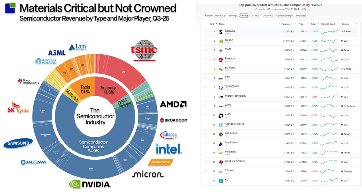 Wykres z lewej miesza “Semiconductor Companies” i “Foundry”. Firmy “Foundry”, takie jak TSMC, produkują np. dla NVIDIA. Tak więc jaki sens mają podane procenty? Firmy takie jak ASML dostarczają urządzenia zarówno do “Foundry” jak i do “Semiconductor Companies”, więc tutaj też jest pomieszanie z poplątaniem. Po prawej jest lista TOP17 firm z branży określanej jako “Semiconductors”, ale i tutaj pomieszane są różne firmy.