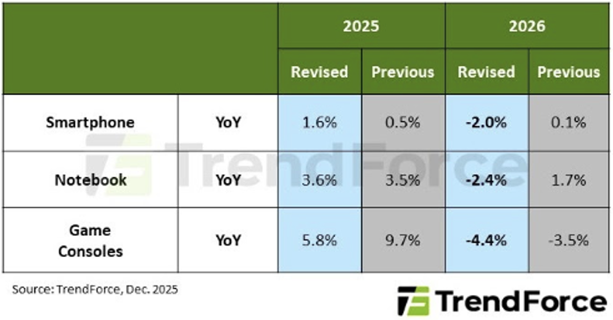 Rosnące ceny pamięci zwiększyły koszty materiałów różnych produktów elektronicznych. To z kolei spowodowało, że wybrane firmy podniosły ceny, co z kolei może zmniejszyć popyt rynkowy, według TrendForce. Po obniżeniu w listopadzie swoich prognoz dostaw smartfonów i laptopów na 2026 r. firma badawcza obniżyła niedawno również prognozę dostaw konsol do gier na 2026 r.: