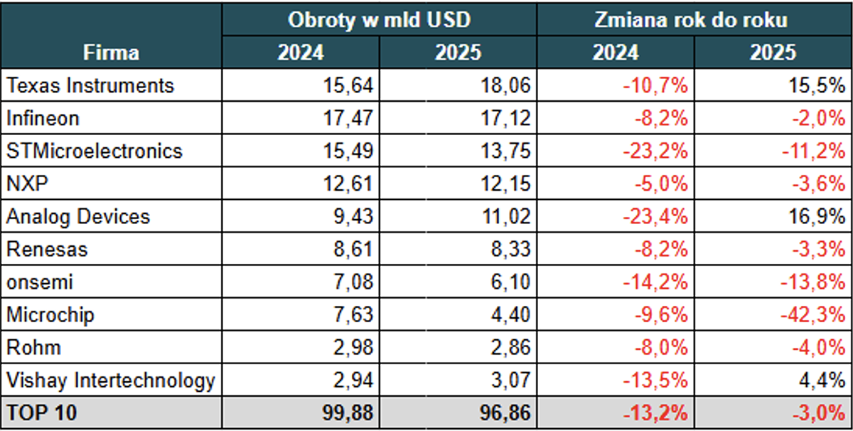 Energetyka i odnawialne źródła energii, w tym systemy zasilania centrów danych, związanych z szybkim rozwojem AI, mogą skompensować słabą koniunkturę w segmencie motoryzacyjnym i spowodować że w roku 2026 “klasyczne” firmy półprzewodnikowe osiągną wzrost obrotów, ale raczej będzie to jednocyfrowy wzrost w procentach. Mimo to, byłby to na koniec bardzo optymistyczny wniosek.