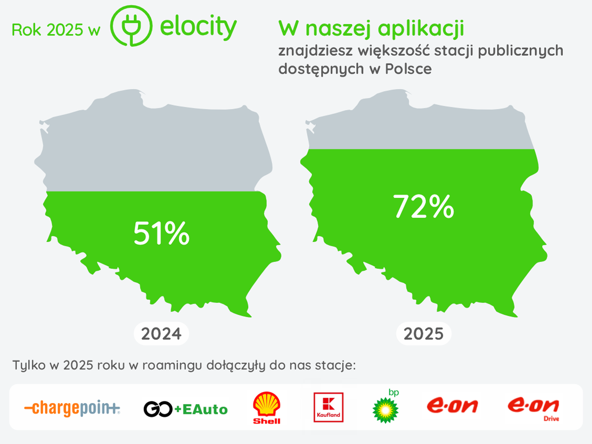 Na koniec 2025 roku autorskie oprogramowanie Elocity obsługiwało 4 046 ogólnodostępnych punktów ładowania aut elektrycznych (o 29% więcej niż w 2024 roku. Wtedy było to 3 130 punktów). Dodatkowo, w oparciu o software, działa 2 586 punktów prywatnych. Równolegle, dzięki rozwojowi roamingu, aplikacja Elocity integrowała także stacje partnerskie, zwiększając realną dostępność infrastruktury dla kierowców. Tylko w 2025 roku do grona partnerów roamingowych Elocity dołączyły m.in. BP, Shell, Kaufland, E.ON Drive, EDRI Poland, GO+E.Auto oraz ChargePoint.