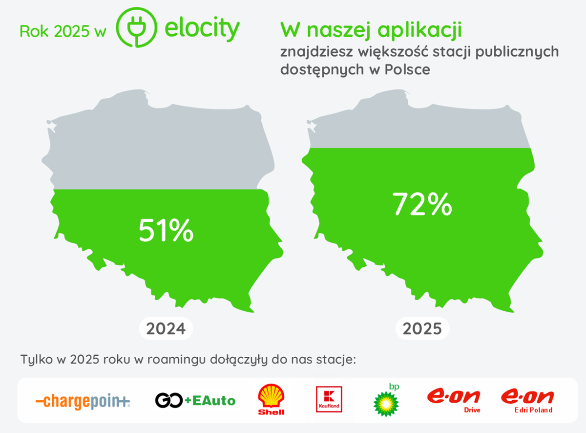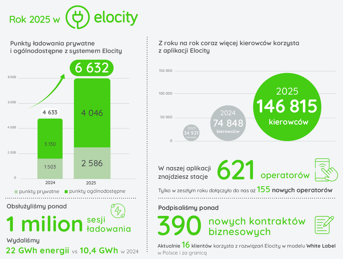 Na koniec 2025 roku autorskie oprogramowanie Elocity obsługiwało 4 046 ogólnodostępnych punktów ładowania aut elektrycznych (o 29% więcej niż w 2024 roku. Wtedy było to 3 130 punktów). Dodatkowo, w oparciu o software, działa 2 586 punktów prywatnych. Równolegle, dzięki rozwojowi roamingu, aplikacja Elocity integrowała także stacje partnerskie, zwiększając realną dostępność infrastruktury dla kierowców. Tylko w 2025 roku do grona partnerów roamingowych Elocity dołączyły m.in. BP, Shell, Kaufland, E.ON Drive, EDRI Poland, GO+E.Auto oraz ChargePoint.