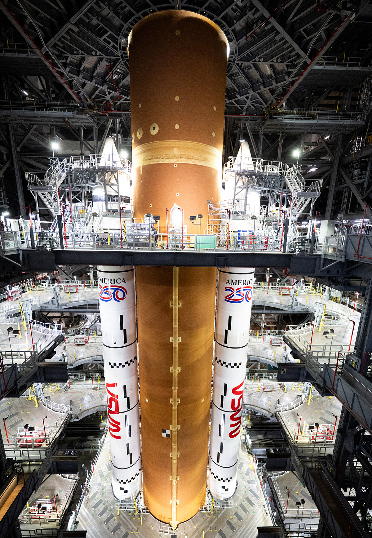 Rakieta Space Launch System należąca do NASA wewnątrz hali nr 3 budynku montażowego pojazdów kosmicznych, gdzie w sobotę 20 grudnia 2025 r. w Centrum Kosmicznym im. Kennedy’ego NASA na Florydzie, zespoły czekały na przybycie członków załogi misji Artemis II. Astronauci NASA: Reid Wiseman, dowódca; Victor Glover, pilot; Christina Koch, specjalistka misji oraz  Jeremy Hansen z Kanadyjskiej Agencji Kosmicznej, specjalista misji, weszli na pokład statku kosmicznego Orion umieszczonego na szczycie rakiety w ramach testu demonstracyjnego odliczania Artemis II. W ramach tej operacji załoga Artemis II i zespoły startowe symulowały przebieg dnia startu, w tym zakładanie kombinezonów, wyjście na zewnątrz oraz wejście do statku kosmicznego i wyjście z niego. W ramach kampanii Artemis, NASA wyśle astronautów na Księżyc w celu dokonania odkryć naukowych, uzyskania korzyści ekonomicznych oraz stworzenia podstaw dla pierwszych załogowych misji na Marsa. Źródło: NASA/Joel Kowsky