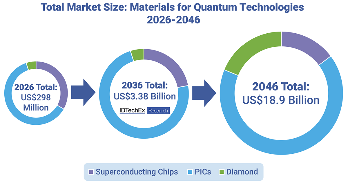 Technologia kwantowa jest obecnie jednym z najszybciej rozwijających się rynków głębokich technologii, ale jej wydajność i skalowalność są często ograniczane przez wyzwania związane z materiałami, komponentami i procesami produkcyjnymi. W raporcie IDTechEX przeanalizowano możliwości i pojawiające się rozwiązania w zakresie materiałów do obliczeń kwantowych, wykrywania kwantowego i komunikacji kwantowej. Całkowita wartość rynku chipów nadprzewodzących, PIC i diamentów do technologii kwantowych ma osiągnąć 3,38 mld USD do 2036 r. i 18,9 mld USD do 2046 r., przy CAGR na poziomie 23,1% w całym okresie prognozy.