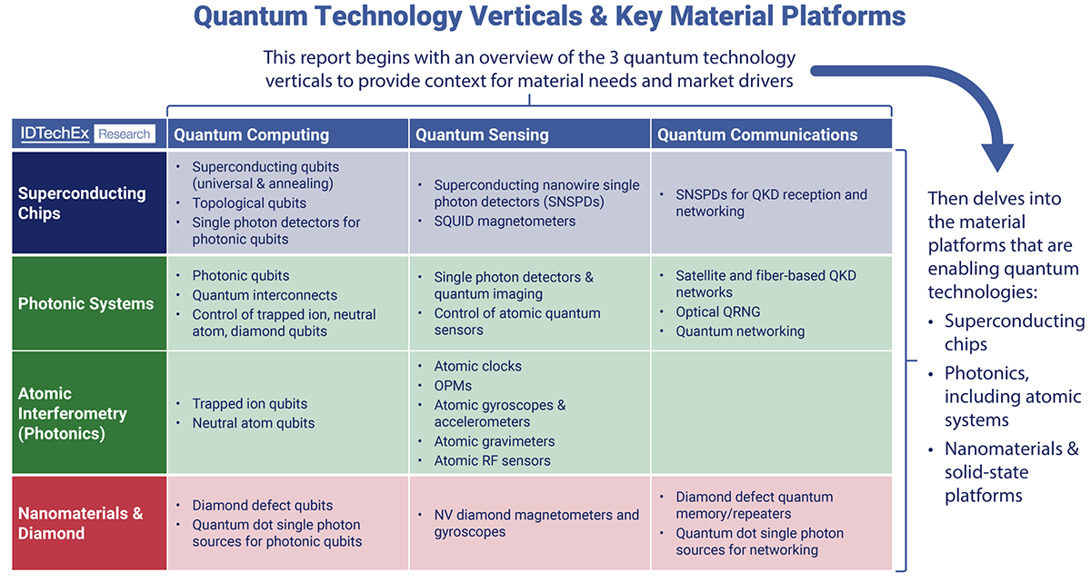 Podział ten jest zazwyczaj stosowany w rządowych i komercyjnych strategiach kwantowych, a firma IDTechEx opublikowała indywidualne raporty z badań rynkowych zawierające dogłębną analizę każdej z tych kategorii.