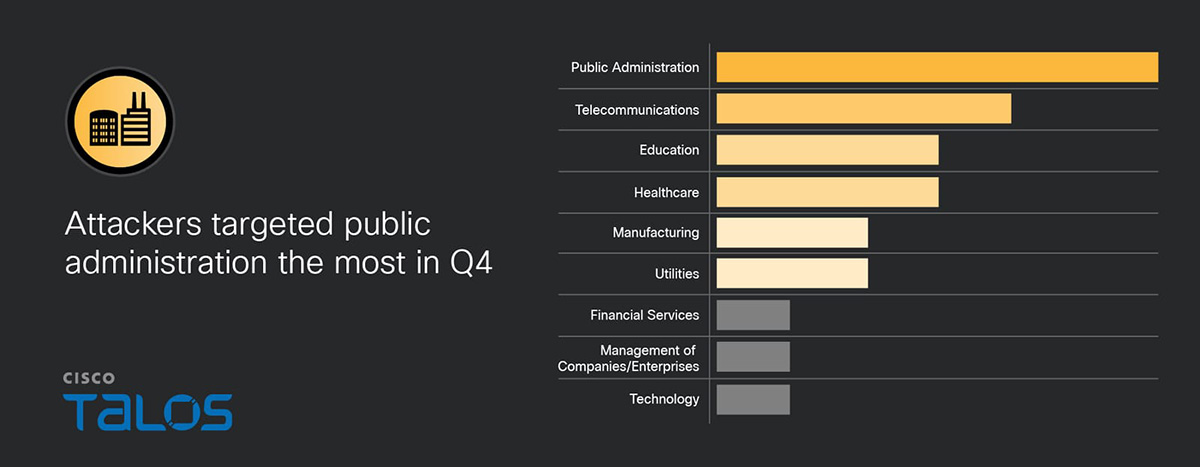 Podobnie jak w poprzednim kwartale, to sektor administracji publicznej był najczęściej atakowany. Organizacje te pozostają atrakcyjnym celem ze względu na: