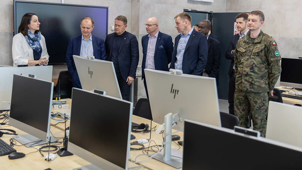 Delegacja zwiedziła laboratoria Wydziału Elektroniki, w tym pracownię radia programowalnego oraz pracownię, w której projektowane i konstruowane są bezzałogowe statki powietrzne oraz systemy antydronowe | źródło: WAT