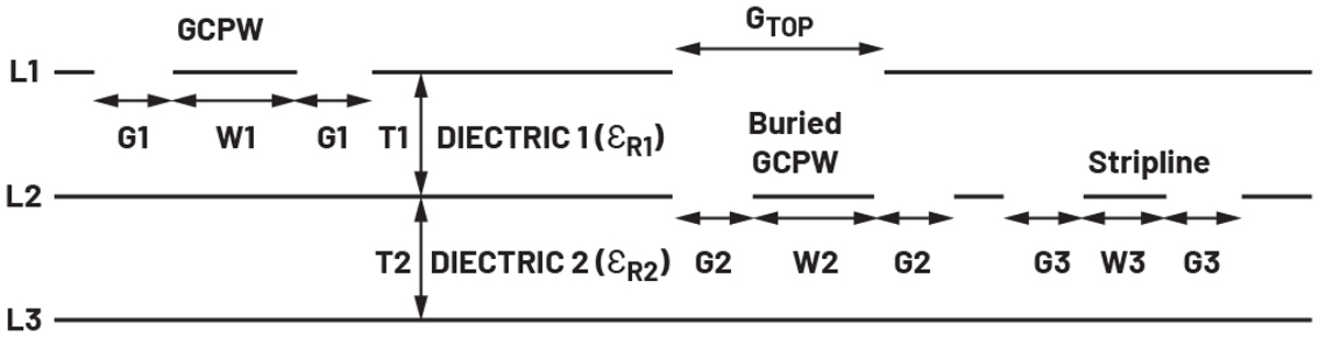 Na rysunku 2 przedstawiono przekrój poprzeczny linii GCPW, zagrzebanej GCPW i linii paskowej oraz ważne zależności geometryczne, które określają nominalną impedancję linii. Są to szerokość linii (W1/W2/W3), odległość boczna od krawędzi linii do sąsiedniej płaszczyzny uziemienia (G1/G2/G3), grubość materiałów dielektrycznych (T1/T2) oraz względna przenikalność elektryczna materiałów dielektrycznych (εR1/εR2). Na rysunku 2 nie pokazano grubości miedzi użytej do wykonania linii, ani wymaganej izolacji uziemienia. Grubość miedzi powinna być wprawdzie wzięta pod uwagę, ale ma ona drugorzędne znaczenie. Wymagana izolacja uziemienia zostanie omówiona w części 2. Wybór topologii zależy od akceptowalnego tłumienia ścieżek, częstotliwości, wymaganej izolacji między liniami, dostępnej przestrzeni i grubości dielektryka materiału zastosowanego do wykonania PCB.