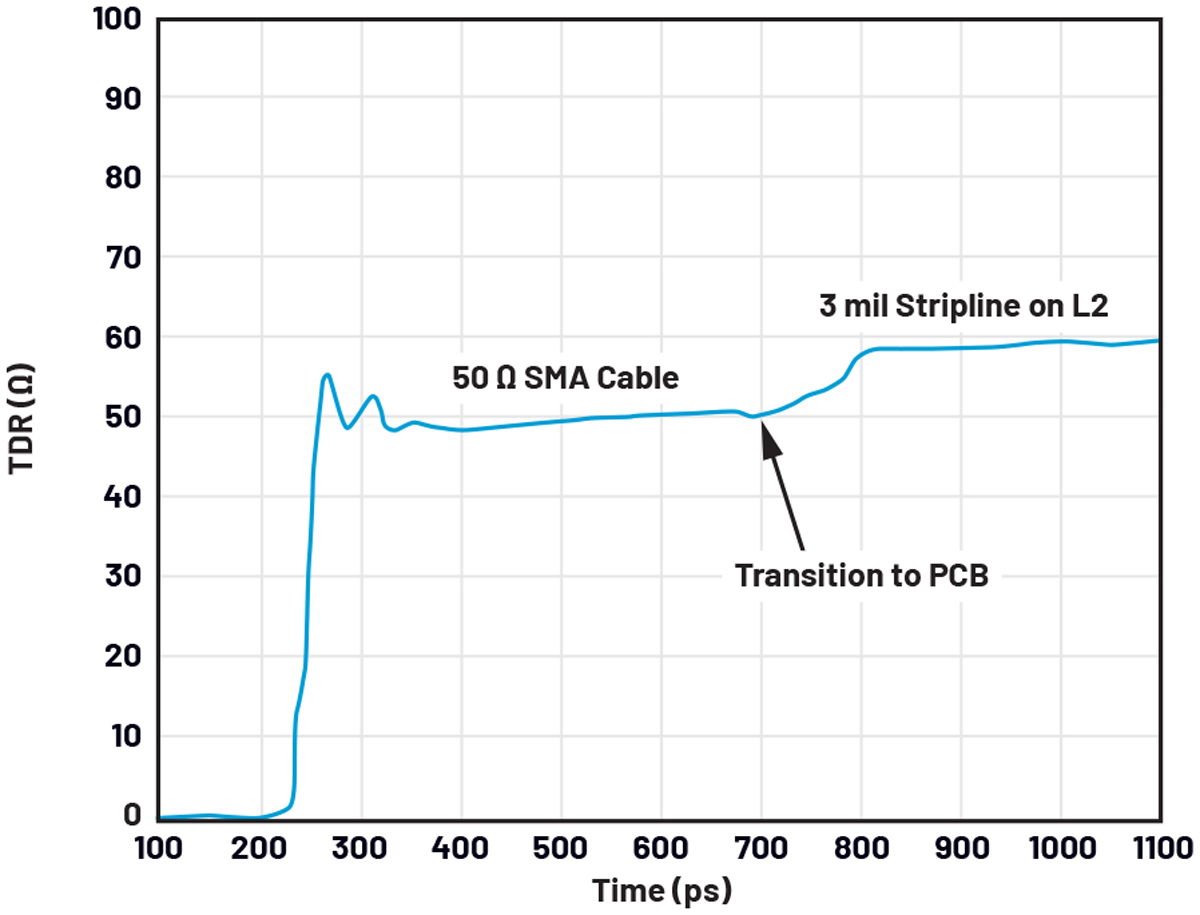 Na jakość topologii linii RF wpływają tolerancje produkcyjne. Wybór optymalnej geometrii linii dokonany pod kątem zminimalizowania tych efektów ma kluczowe znaczenie dla uzyskania dokładnej impedancji linii 50 Ω. Na rysunku 3 przedstawiono wykres reflektometrii w dziedzinie czasu (TDR) dla linii paskowej o szerokości 3 milsów zaprojektowanej dla 50 Ω, ale została zmierzona jako około 60 Ω. Aby uzyskać tłumienie odbić na poziomie 20 dB lub lepszym błąd nie powinien przekraczać ±10% (45 Ω do 55 Ω).