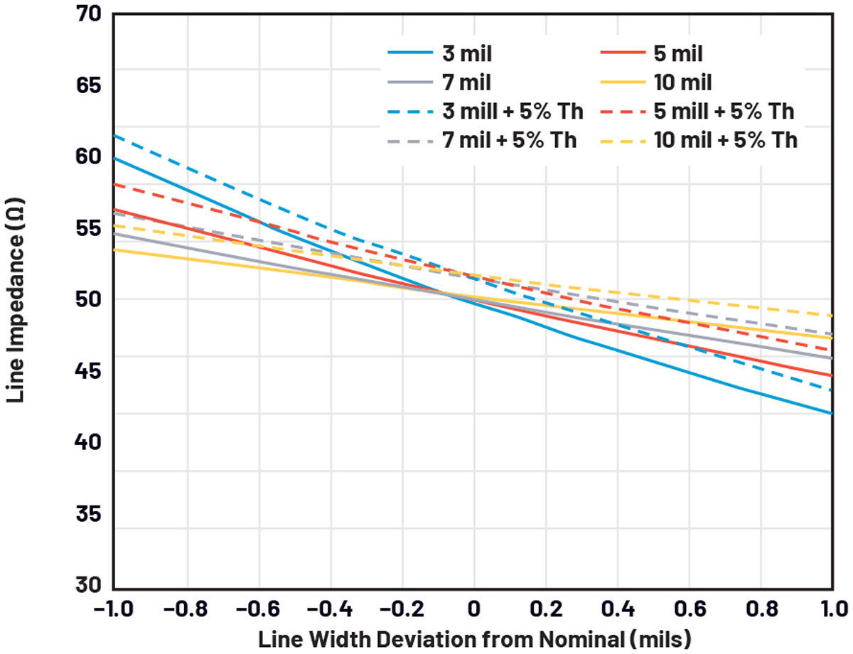 Na rysunku 4 przedstawiono zależność impedancji linii5 dla projektu linii paskowej od odchylenia szerokości linii od wartości nominalnej dla wielu szerokości linii. Pokazano ponadto odchylenie impedancji, które powstaje wtedy, gdy dielektryk jest o 5% grubszy niż nominalny (przy założeniu grubości miedzi linii paskowej wynoszącej 0,7 milsów i εR=3,1). W idealnym przypadku nachylenie wszystkich linii wynosiłoby 0 i nie występowałoby przesunięcie punktów przecięcia między liniami, co oznaczałoby brak różnic produkcyjnych. Należy zauważyć, że szersze linie mają mniejsze nachylenie, podczas gdy węższe linie mają nachylenie bardziej strome. W praktyce, w przypadku rozbieżności w produkcji, preferowana jest szersza nominalna szerokość linii. Niestety, przy zwiększeniu grubości dielektryka o 5%, przesunięcie impedancji jest w przybliżeniu równe, niezależnie od nominalnych szerokości linii. Oznacza to, że aby osiągnąć docelową tolerancję impedancji linii, producent musi spełnić wymagania dotyczące końcowej grubości po laminacji mieszczące się w założonej tolerancji. Skupiono się na zwiększeniu grubości dielektryka (w przeciwieństwie do zmniejszenia grubości), ponieważ w wielu partiach produkcyjnych płytek o różnych topologiach linii zaobserwowano, że impedancja linii jest zazwyczaj większa lub równa wartości docelowej.