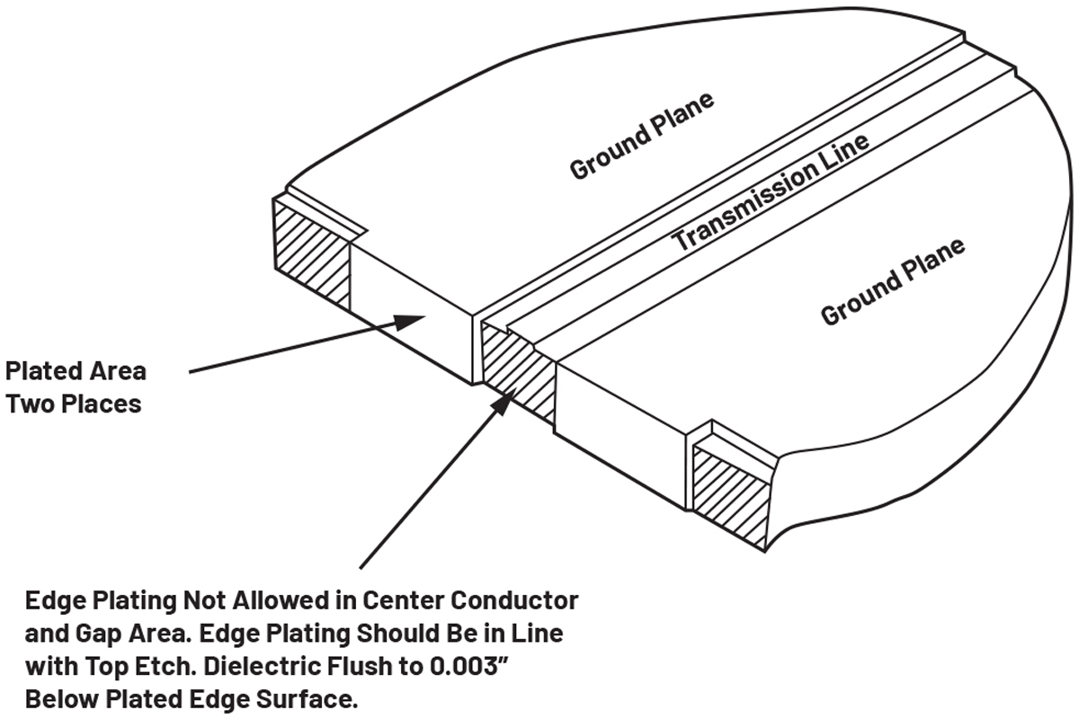 Szczelinę między płaszczyzną uziemienia a krawędzią płytki można zmniejszać kilkoma sposobami. Pierwszy polega na zastosowaniu metalizacji krawędziowej w miejscach złączy na krawędzi płytki. Prawidłowo wykonana metalizacja na krawędzi płytki skutecznie eliminuje szczelinę. Metalizacja krawędzi jest połączona zarówno z górną, jak i z dolną poziomą płaszczyzną uziemienia, a w razie potrzeby może również łączyć się z takimi płaszczyznami wewnętrznymi. Metalizacja krawędzi powinna znajdować się tylko na uziemionych częściach krawędzi, dlatego między pokryciem w miejscach złączy, gdzie znajduje się linia transmisyjna, powinna pozostać szczelina. Pokazano to na rysunku 6.