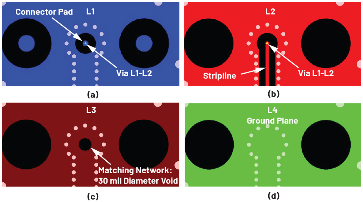Ponadto przejście na płytkę można dopasować pod kątem częstotliwości radiowych, co pozwala zminimalizować nieciągłość impedancji. Dostawcy złączy, tacy jak SVMicrowave, tworzą niestandardowe footprinty dla danego projektu z odpowiedni zaprojektowanymi liniami sygnałowymi i układem warstw (stack-up). Footprint złącza pionowego SVMicrowave, które łączy się z linią paskową, pokazano na rysunku 8. Są tu widoczne cztery warstwy PCB z rzędami przelotek (via fencing). Pusta przestrzeń o średnicy 30 milsów na warstwie 3 (L3) jest dopasowaniem do złącza i jest pokazana na rysunku 8c.