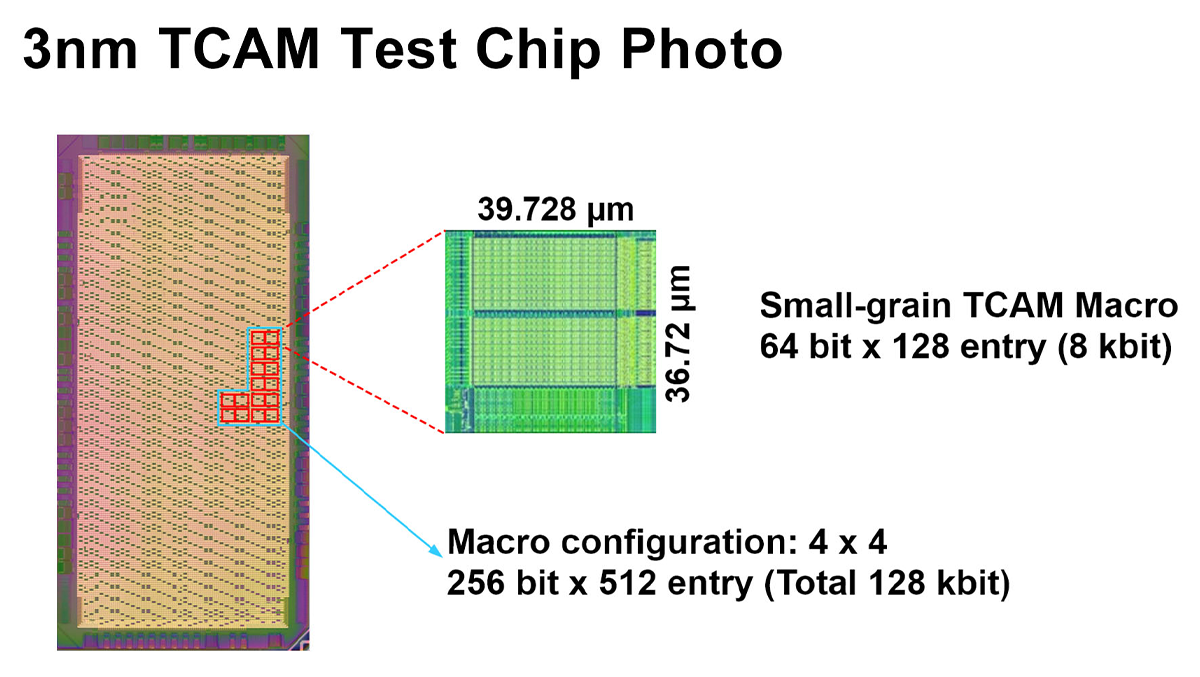 Nowo opracowane makra sprzętowe TCAM są obsługiwane przez kompilator pamięci o drobnej ziarnistości — szerokość klucza wyszukiwania wynosi od 8 do 64 bitów, a głębokość wpisu od 32 do 128. Większe konfiguracje (np. 256 bitów × 4096 wpisów) są realizowane poprzez połączenie tych makr sprzętowych z automatycznym generowaniem makr programowych za pomocą narzędzi, aby zapewnić konfigurowalne pojedyncze makro, które obejmuje szeroki zakres zastosowań na jednym układzie scalonym. Pozwala to osiągnąć gęstość pamięci wynoszącą 5,27 Mb/mm².