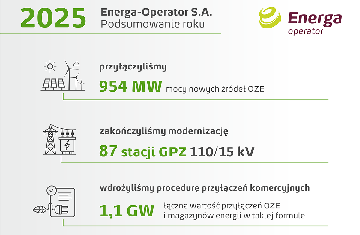 – Rok 2025 był dla Energa‑Operator czasem intensywnego rozwoju infrastruktury, technologii i wsłuchiwania się w potrzeby klientów. Skala modernizacji sieci, rekordowa moc wydanych dla OZE warunków przyłączenia i szybka cyfryzacja usług pokazują, że wzmacniamy zdolność sieci do obsługi nowoczesnej energetyki. Dzięki inwestycjom i nowym rozwiązaniom, takim jak taryfy „dla dynamicznych” czy Interwencyjna Dostawa Mocy Czynnej, tworzymy warunki do bezpiecznej integracji coraz liczniejszych źródeł odnawialnych i aktywizujemy naszych klientów, co zwiększa elastyczność i stabilność systemu elektroenergetycznego – powiedział Robert Świerzyński, prezes Energa‑Operator.