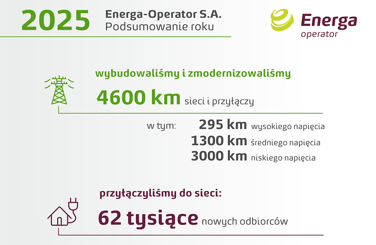 W 2025 roku Energa-Operator zbudowała i zmodernizowała o blisko 1000 km sieci więcej niż w roku poprzednim. W sumie prawie 4600 km sieci i przyłączy, w tym 295 km linii wysokiego napięcia, blisko 1300 km średniego napięcia oraz ponad 3000 km niskiego napięcia. Spółka zakończyła też modernizację 87 stacji GPZ 110/15 kV. Inwestycje te pozwoliły przyłączyć do sieci niemal 62 tysiące nowych odbiorców.