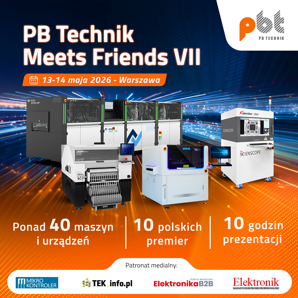 W dniach 13-14 maja 2026 odbędzie się siódma edycja PB Technik Meets Friends. Jest to wydarzenie, które łączy ekspertów, partnerów i liderów branży elektroniki. To równie okazja do obejrzenia nowoczesnych rozwiązań, wymiany doświadczeń i poznania trendów kształtujących przyszłość produkcji elektronicznej.