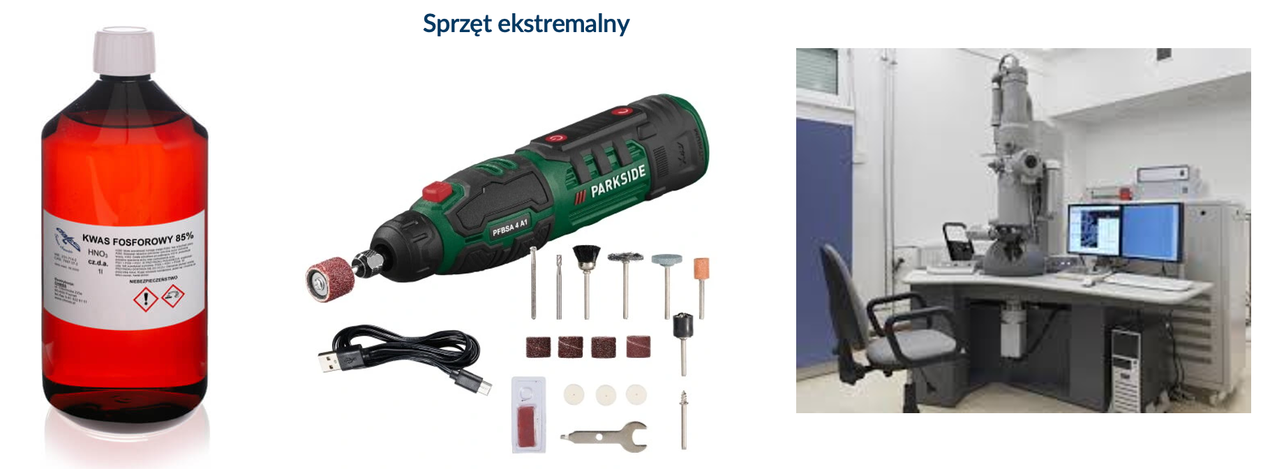 - Sprzęt ekstremalny: kwas, narzędzia elektryczne, scanningowy mikroskop elektronowy, maszyny rentgenowskie (niektórzy korzystają z usług lokalnych dentystów).