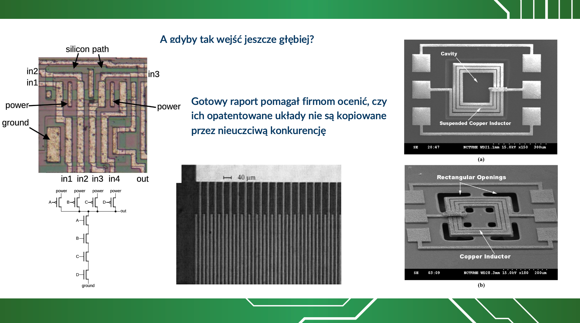 – Wybrane przez zamawiające firmy układy scalone trafiały pod „obróbkę”. Pozbawiano je obudów (decapping) przy pomocy kwasu i usuwano nóżki. Złoty wire bonding nie ulegał rozpuszczeniu, podobnie jak krzem. Potem chipy trafiały do precyzyjnych maszyn, których zadaniem było zeszlifowanie krzemu, warstwa po warstwie, aby można było wykonać dokładne zdjęcia każdej z nich. Jeśli litografia była zbyt drobna, wspomagano się mikroskopami elektronowymi i radiografią. Zdjęcia struktur trafiały do działu „Image processing”, który przenosił je do specjalnego programu, gdzie nanoszone były przelotki, ścieżki, pola masy i potencjałów. Powstawał interaktywny „plan” całego układu. Zadaniem inżynierów-analityków było rozpoznanie w strukturach krzemowych pojedynczych tranzystorów i naniesienie ich na ten „plan”. Powodowało to pojawienie się danego tranzystora w programie, przypominającym interfejsem KiCada, czy Altiuma.
