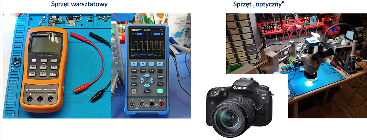 - Sprzęt „optyczny”: termowizja, mikroskopy, aparat fotograficzny, komputer i cierpliwość, programy do rysowania schematów (KiCad, Altium);