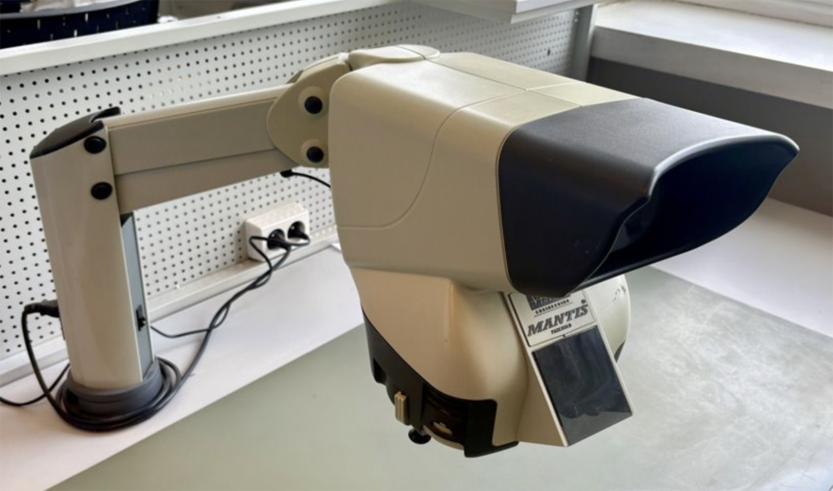 Mantis pierwszej generacji. Pierwszy na świecie mikroskop stereoskopowy bezokularowy z 1996 roku. Obudowa lekko pożółkła przez prawie 30 lat użytkowania w wyniku działania promieni UV, ale funkcjonalność pozostała na tym samym poziomie, co pierwszego dnia – jak zapewnił Szymon Gumółka, który rozmawiał z użytkownikiem urządzenia.