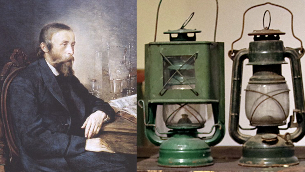 Ignacy Łukasiewicz (źródło: Wikipedia) i lampy naftowe (źródło: gov.pl)