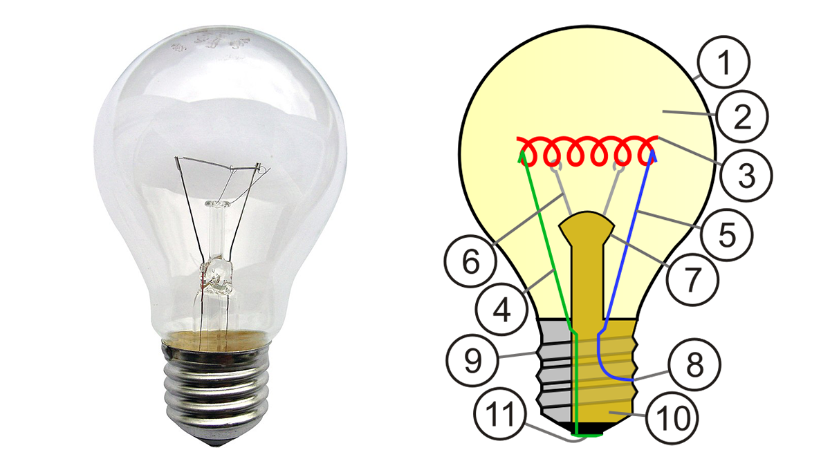 Budowa żarówki: 1 – szklana bańka, 2 – gaz obojętny, 3 – żarnik wolframowy, 4 i 5 – druty kontaktowe, 6 – podpórka, 7 – słupek, 8 – gwint kontaktowy, 9 – trzonek gwintowany, 10 – krążek izolacji cieplnej, 11 – stopa kontaktu elektrycznego-podpórka. Źródło: Wikipedia